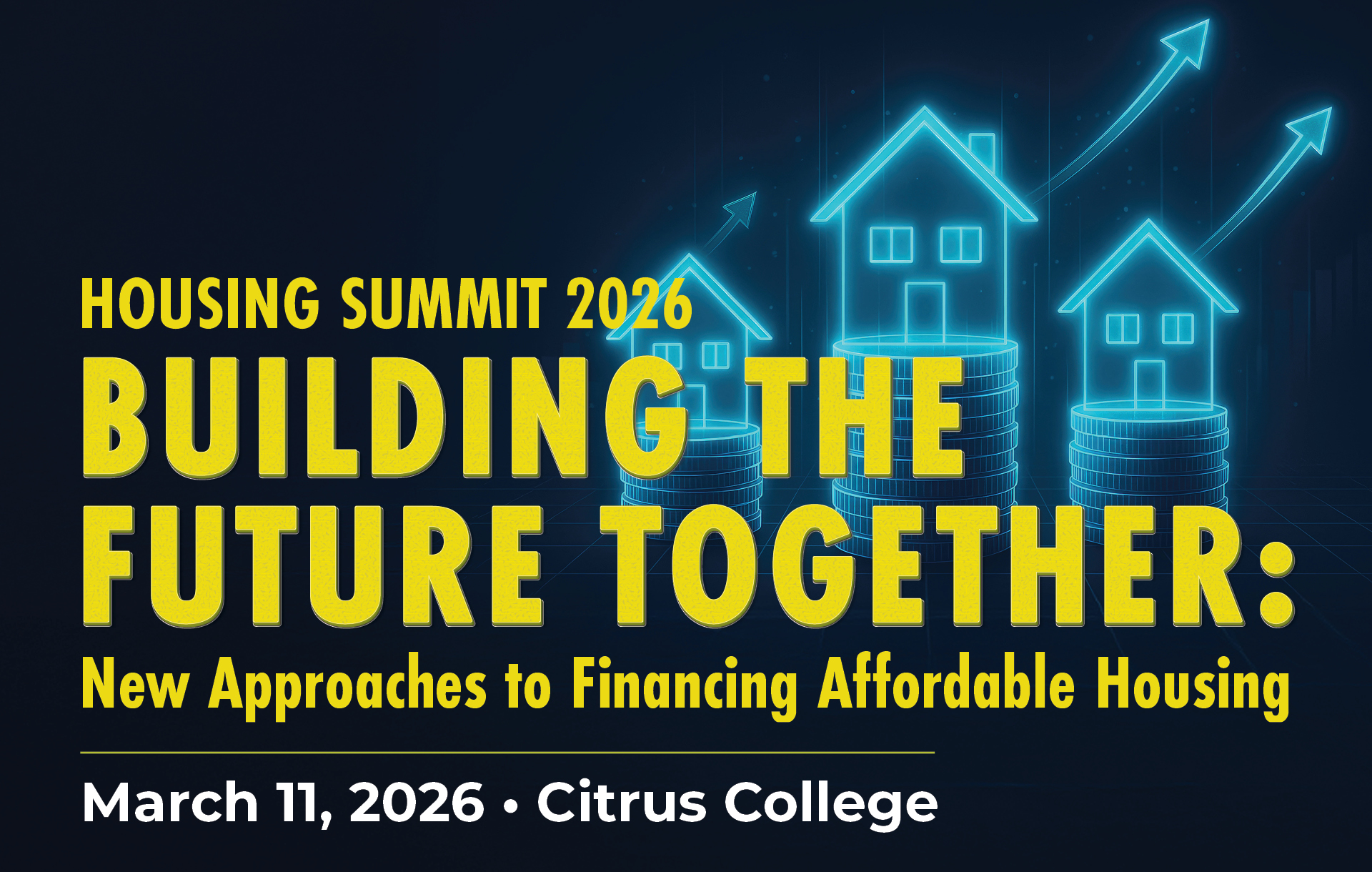 Building the Future Together: New Approaches to Financing Affordable Housing Wednesday, March 11 • 9:00 a.m. – 11:45 a.m.Citrus College, Glendora Join us at our 2026 Housing Summit at Citrus College for a morning filled with an inspiring keynote, insightful discussions, and networking opportunities as we discuss innovative ideas to finance affordable housing. Highlights: Keynote